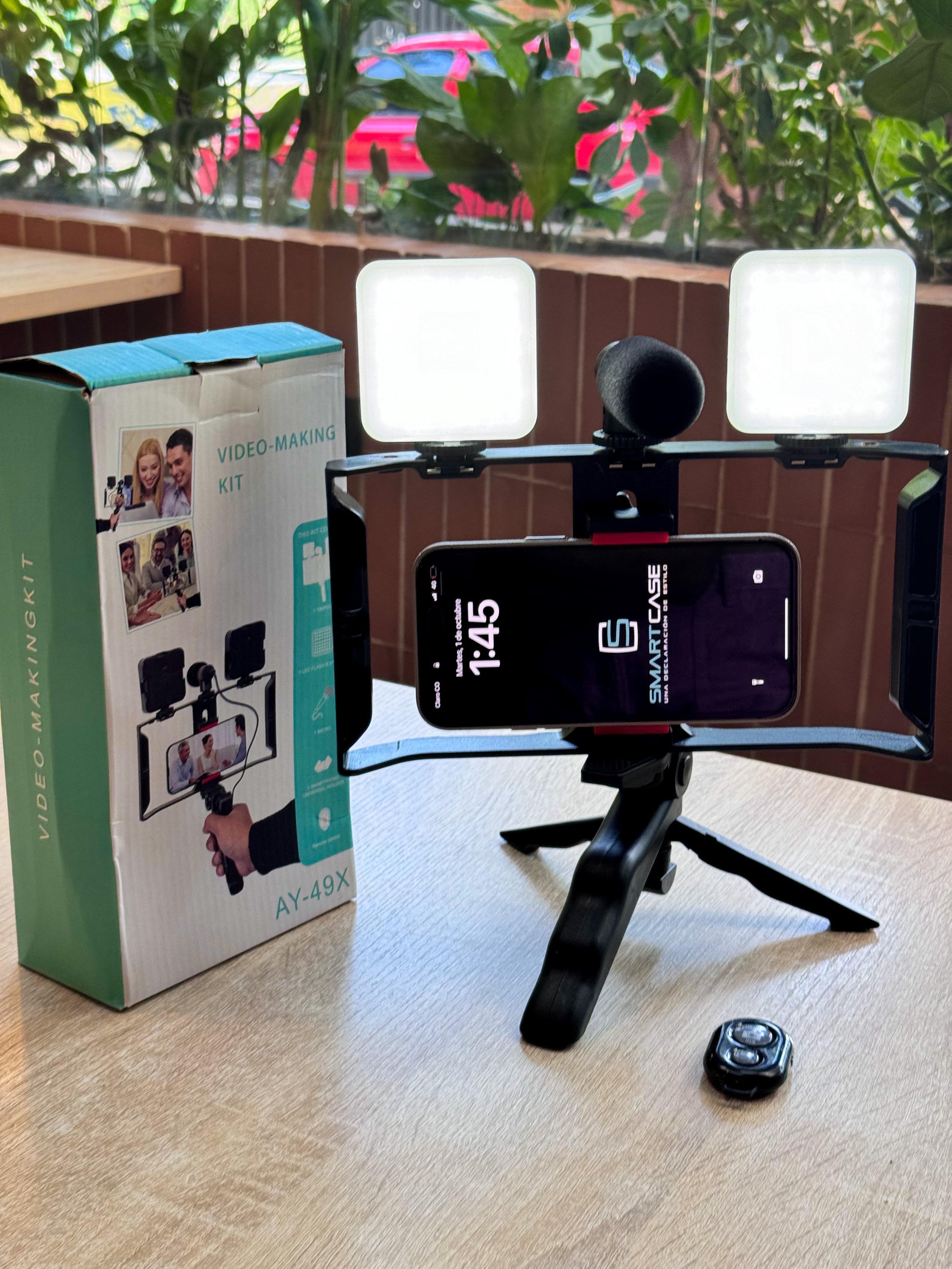 Componentes integrados: soporte para celular, luz LED y micrófono condensador.